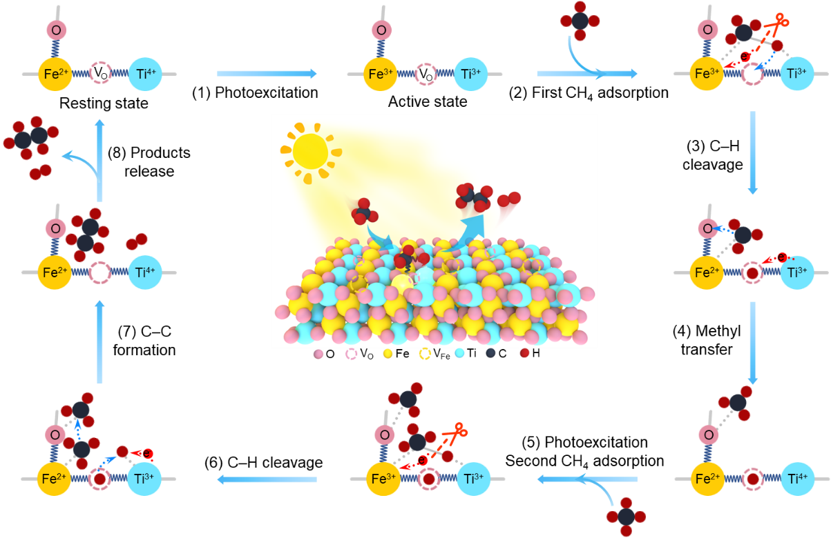 针对上述难题,吉林大学李路教授和中国科学院长春应用化学研究所宋术岩研究员团队提出了一种创新性的催化剂设计策略:在具有高活性{012}晶面的缺陷钛铁矿(Fe1-xTiO3-x-NS)上构筑受阻Fe2+–□–Ti4+双金属位点。该双金属位点与相邻晶格氧协同作用,使催化体系在无氧条件下实现了高效且选择性的光催化甲烷转化,对C2+产物的选择性接近100%,并表现出优异的循环稳定性与出色的抗积碳能力。值得强调的是,该体系的催化性能已超越当前文献报道的金属氧化物及贵金属基光催化剂,展现出优异的应用潜力。机理研究揭示,催化剂的价带主要由Fe离子占据,光生空穴富集在Fe位点;导带则主要由Ti离子占据,能够有效地接收光生电子。光照下,受阻Fe2+–□–Ti4+位点可被激发形成具有长寿命的Fe3+–□–Ti3+活性态,而表面晶格氧在多步反应中起到稳定反应中间体的关键作用。这种协同效应显著降低了C–H键的活化能,优化了甲基迁移与偶联路径,降低了C–C键生成能垒,并有效抑制了甲基中间体的过度脱氢。该双金属–氧协同策略成功打破了传统催化体系中活性与选择性之间的权衡,实现了卓越的催化性能与选择性协同提升。