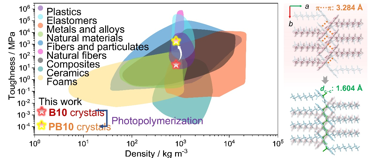 有机晶体材料在柔性电子、仿生器件等领域展现出巨大应用潜力,然而其力学性能的固有矛盾长期制约着实际应用——高强度往往伴随着脆性断裂,而优良的柔韧性又通常以牺牲承载能力为代价。这一“强度-韧性权衡”难题成为该领域发展的关键瓶颈。针对这一挑战,吉林大学张红雨教授团队开创性地发展了可见光驱动的单晶到单晶光聚合策略,在分子水平上实现了晶体结构的精准重构,成功打破了有机晶体材料力学性能的固有局限。