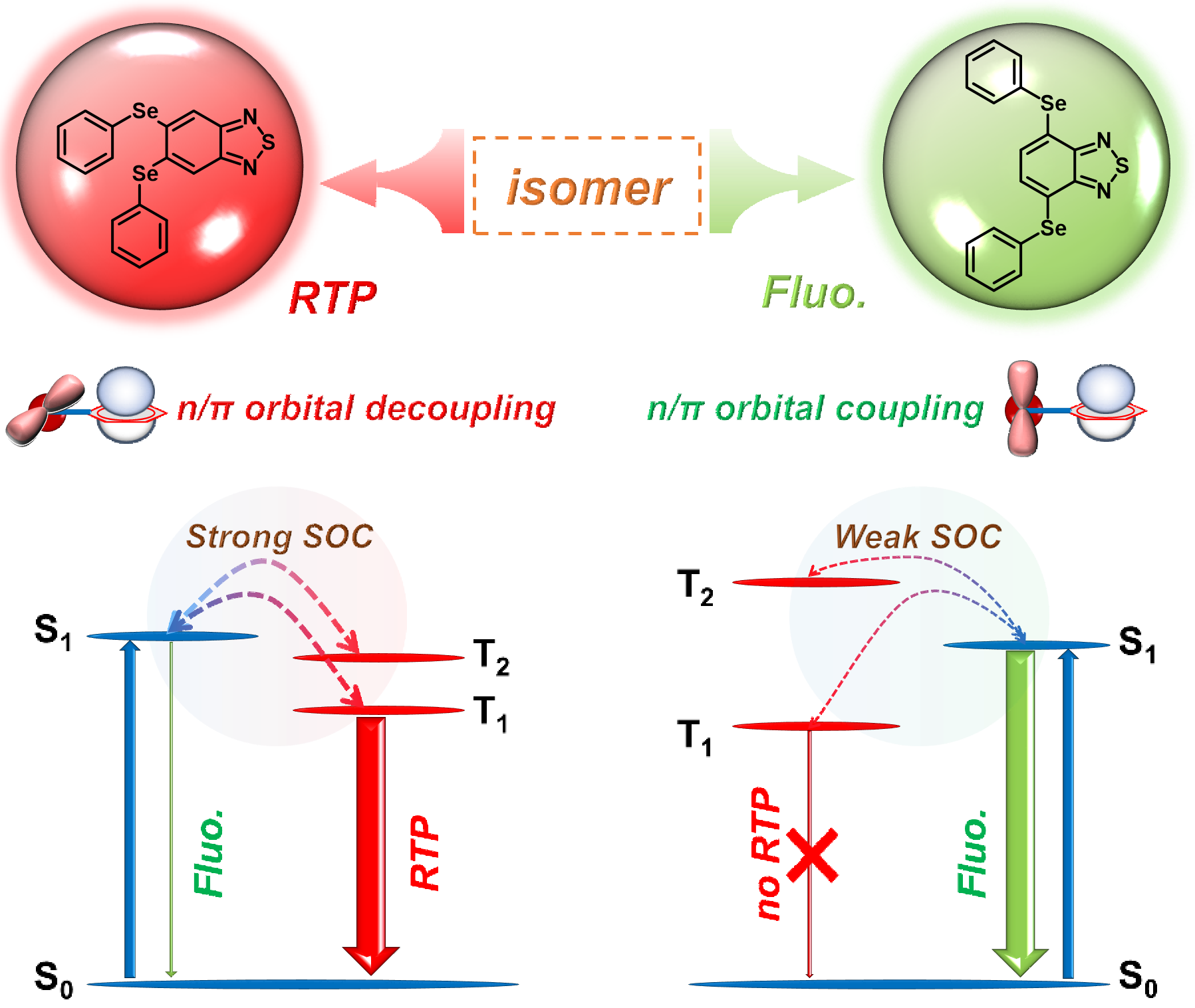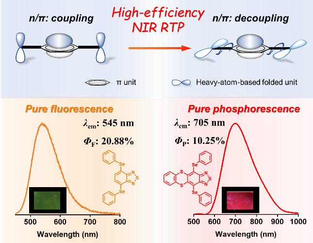 纯有机室温磷光(RTP)材料由于具备高激子利用率和长的三重态激子寿命等独特性质,在有机发光二极管(OLEDs)、信息安全、生物成像、氧气传感等领域具有应用价值。然而,有机分子自身弱的自旋轨道耦合(SOC)以及红光材料加剧的非辐射衰减过程,限制了它们在红光/近红外(NIR)领域的应用前景。为提升材料的磷光性能,通常向有机体系内引入重原子(Se,Br, I)或杂原子(N, P, S)以促进SOC增强,从而有效促进系间窜越(ISC)过程。在这些策略中,深入探究重原子效应和轨道角动量改变在影响SOC方面的内在关联,为设计高效率的纯有机红光/NIRRTP材料提供了理论基础。