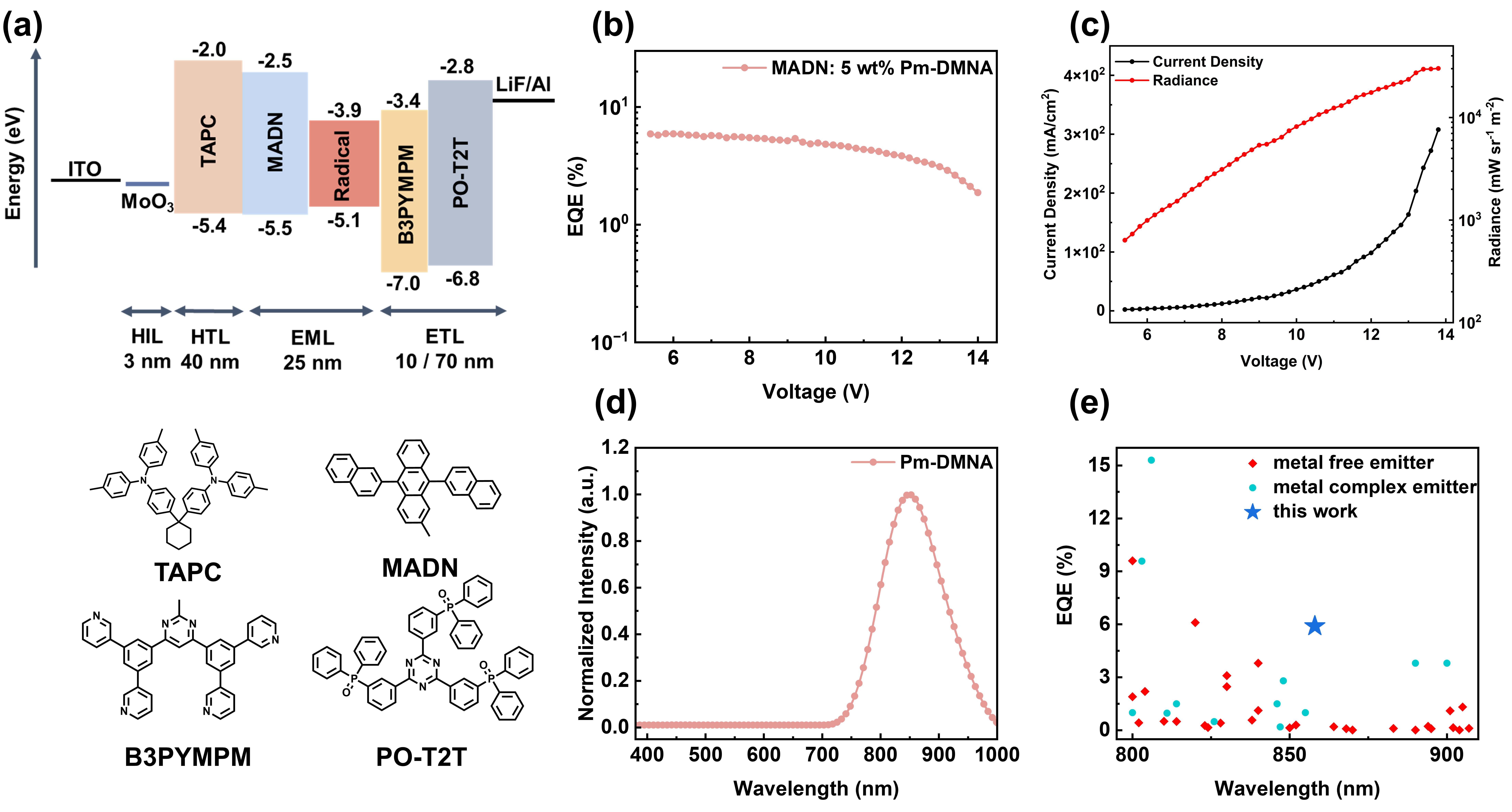 量子化学计算表明,Pm-DMNA具有显著减弱的振动-发光耦合。理论与实验结果共同验证了“分子内氢键+刚性给体”策略的有效性。值得关注的是,基于Pm-DMNA构建的OLED器件实现了855 nm的近红外电致发光,并取得5.9%的EQE,刷新了目前850 nm以上波段有机电致发光效率的纪录,标志着NIR自由基发光材料领域的重要突破。