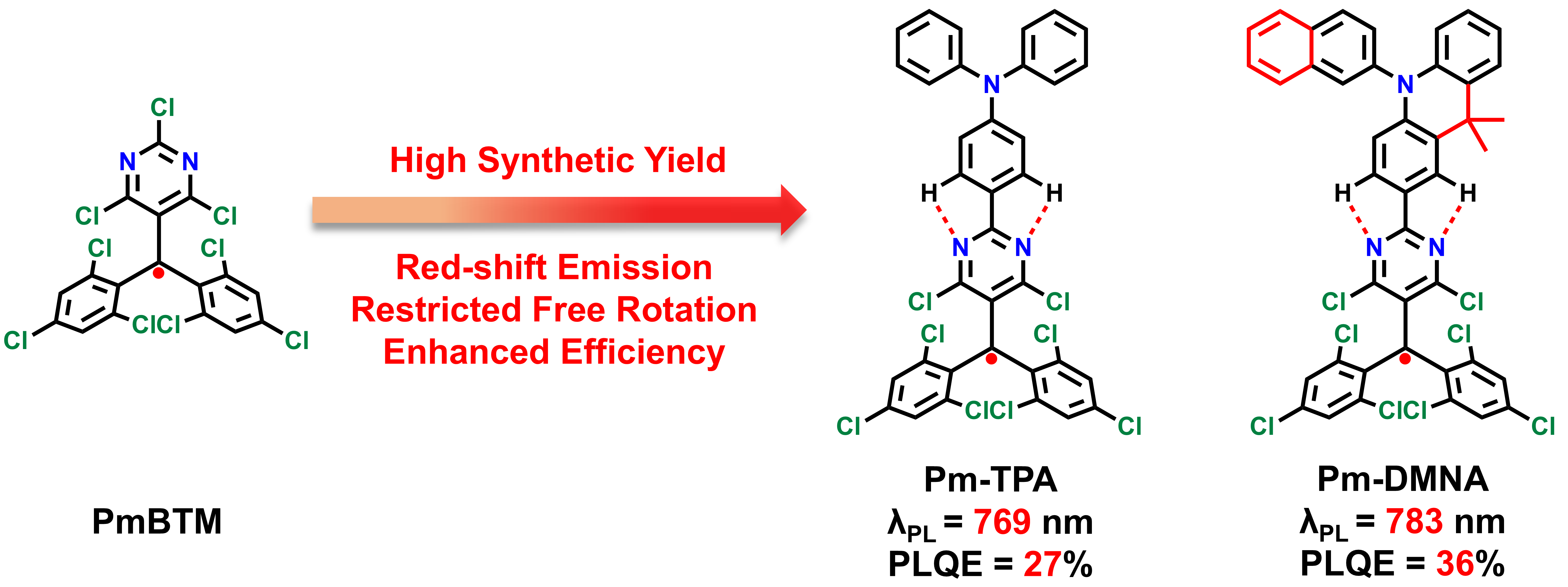 基于上述挑战,吉林大学李峰团队提出了一种结合“分子内氢键”与“刚性给体”的全新设计策略:通过在经典TTM自由基骨架中首次引入嘧啶单元,使其与给体上的芳环形成分子内氢键,从而显著提升给受体的平面性;并进一步通过刚性的二甲基吖啶和大体积的萘限制给体旋转,构建高刚性、高稳定性、强电荷转移特征的NIR自由基发光体系。基于该策略,团队成功获得两种高性能自由基分子Pm-DMNA与Pm-TPA。