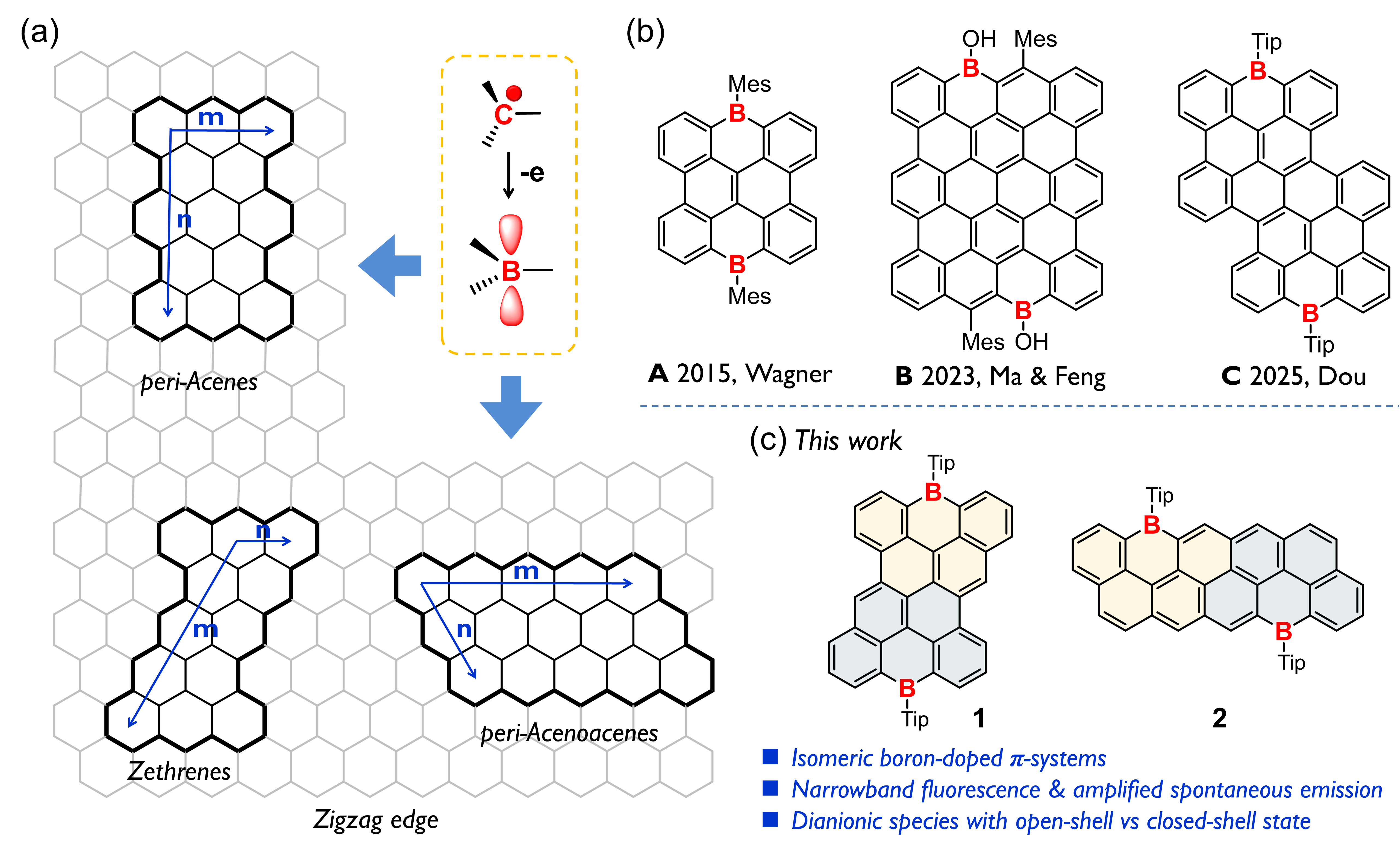 作为一种类似石墨烯片段结构的分子碳,多环芳烃(PAHs)在合成化学、材料科学及相关交叉领域中具有重要的研究价值。锯齿边缘能够诱导PAHs出现自旋极化态,使其表现出独特的开壳电子态和磁学性质,因而这类锯齿边缘PAHs(如二维并苯、Z型并苯和多层并苯)受到广泛关注。然而,开壳自由基结构通常导致较高的氧化活性和较低的稳定性,使得这类化合物的合成和纯化面临巨大挑战,限制其功能探索和材料研究。为解决这些问题,研究人员将杂原子(如硼原子)掺杂进共轭分子骨架,提高分子的稳定性,实现元素组成和拓扑形态的多样性,并赋予其可调控的电子结构和光电性质(图1)。