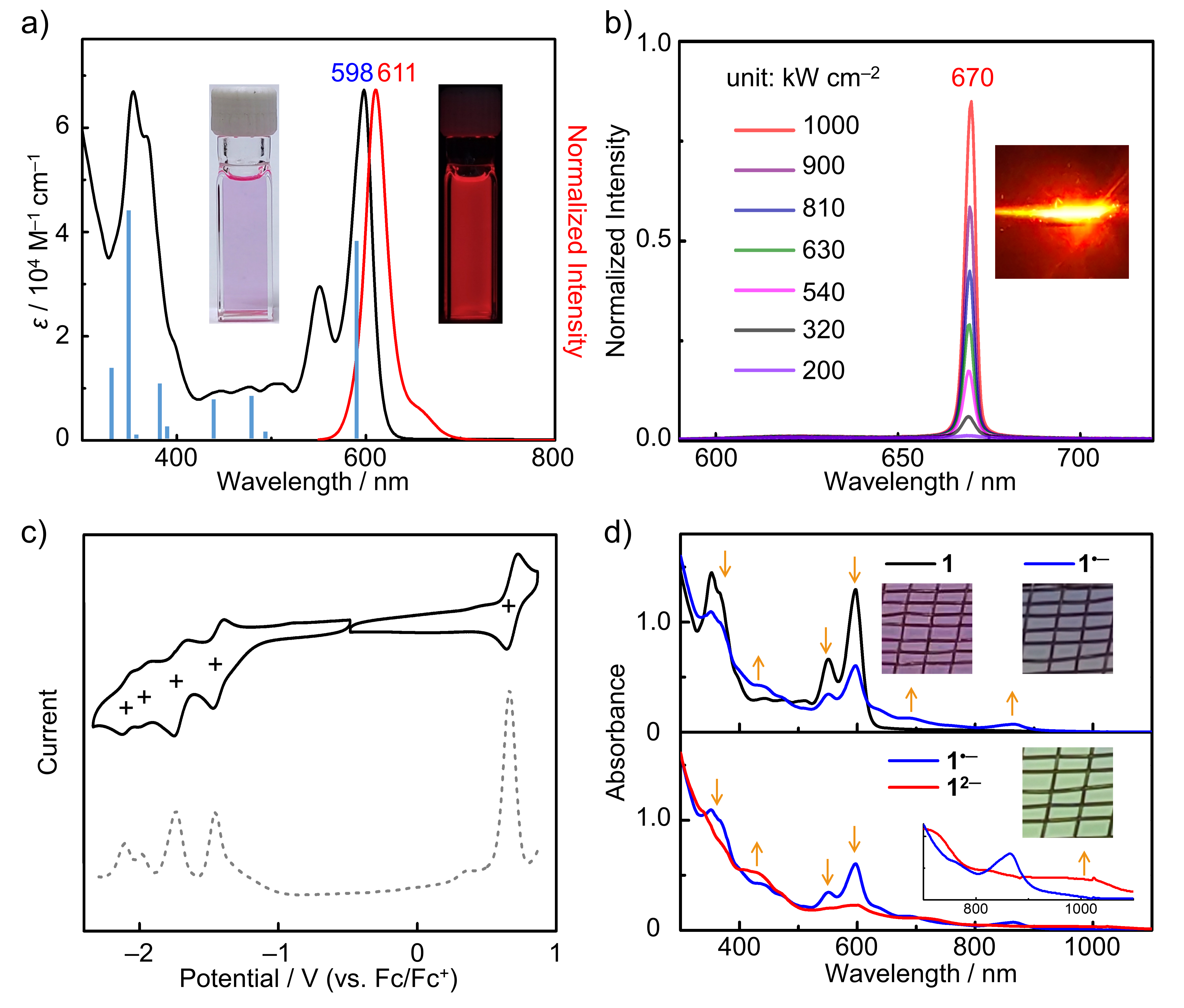 图3.(a)1的吸收和荧光光谱;(b)1/PS掺杂薄膜的放大自发辐射光谱;(c,d)1的循环伏安曲线和原位电化学吸收光谱