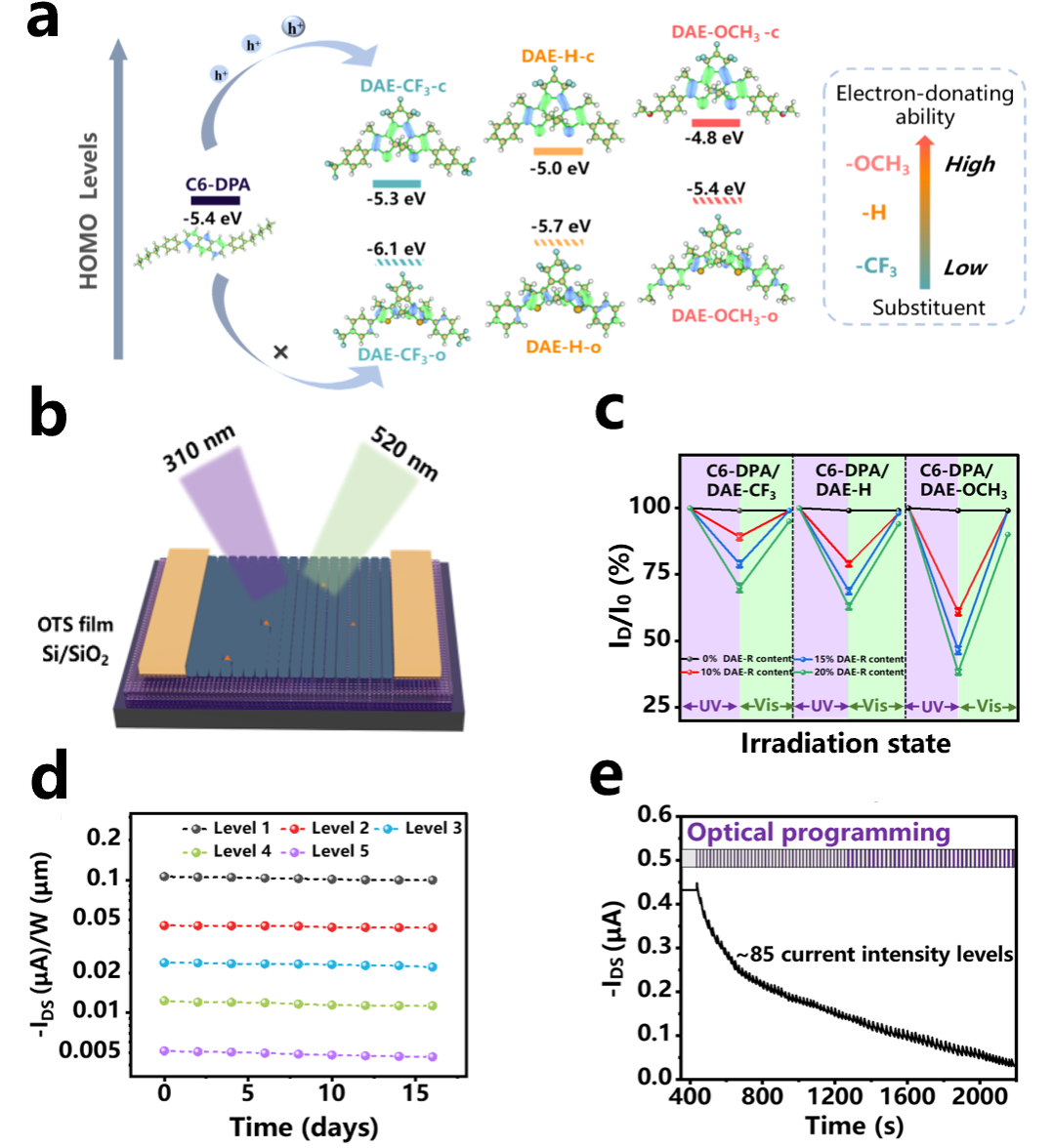 针对这一难题,吉林大学刘朝阳教授团队联合法国斯特拉斯堡大学Paolo Samorì教授团队提出了一种基于“分子工程”的主客体设计策略:将光开关型二芳基乙烯(DAE)分子作为功能性“客体”,均匀分散到由2,6-双(4-己基苯基)蒽(C6-DPA)构成的二维有机分子晶体“主体”矩阵中,成功构建出沟道电流可被光场编程的场效应晶体管。在紫外光照射下,DAE分子发生光致异构化反应,由开环态转变为关环态,其能级随之发生偏移,在C6-DPA晶体矩阵中从电荷传输路径上的中性组分转变为捕获自由电荷的“陷阱”,从而显著抑制沟道电流。而在可见光照射下,DAE分子可逆地恢复为开环态,不再捕获自由电荷,器件电流回到初始水平。整个过程高度可逆且无损于晶体结构。进一步地,通过在DAE分子边缘修饰不同给/吸电子能力的取代基,实现了对其能级的定制化调控,从而系统地揭示了DAE分子结构与C6-DPA电荷输运调控效能之间的构效关系。实验发现,经强给电子基团(-OCH3)修饰的DAE-OCH₃分子与C6-DPA主体之间形成了最大的能级差(0.6 eV),可构成自由电荷的“深陷阱”,仅需5秒紫外光“写入”,器件电流即可实现高达54%的可逆调制,这一效率显著优于传统的非晶共混体系。作为对比,未修饰基团(-H)的DAE分子与主体能级差为0.4 eV,电流调控幅度约为31%;而引入强吸电子基团(-CF3)的DAE分子与主体能级差仅为0.1 eV, 所形成的“陷阱”极浅,调控幅度降至21%。值得注意的是,能级优化后的C6-DPA/DAE-OCH₃主客体体系展现出强大的多级信息存储能力:单个存储单元可稳定区分85个电流状态,对应超过6比特的存储容量,且数据保持特性优异,16天后电流态仍高度稳定。