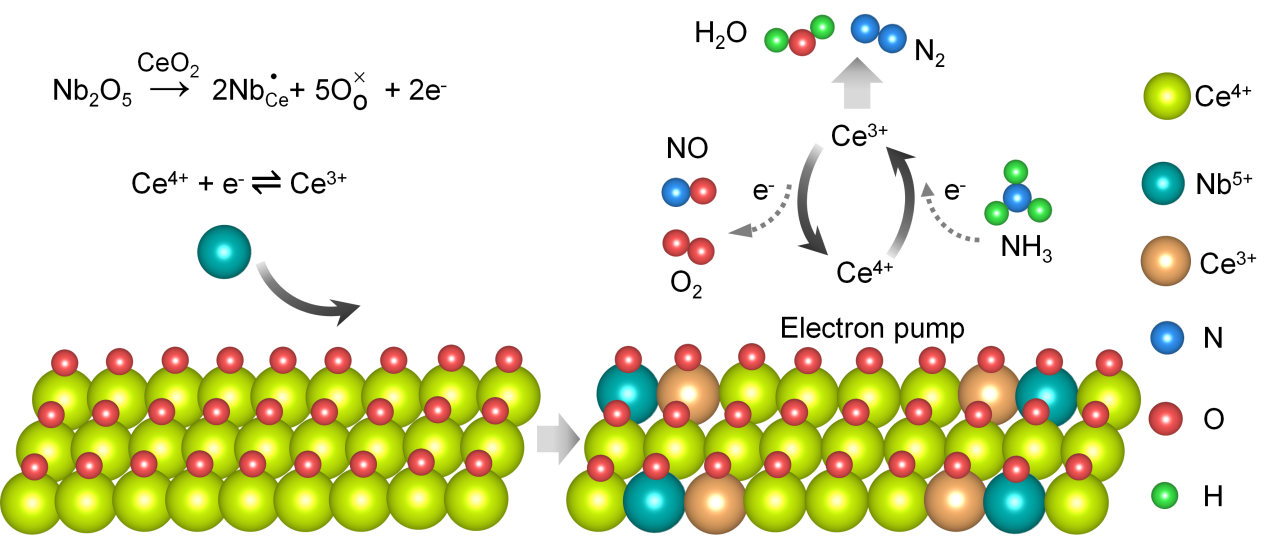 针对上述挑战,吉林大学李广社教授和李莉萍教授团队以CeO2为模型氧化物,采用两步化学合成法构建了一系列电子型Nb5+掺杂CeO2催化剂。Nb5+掺杂能够在CeO2中发挥独特的“电子泵”作用,通过促进Ce3+形成并加快Ce3+/Ce4+之间的可逆循环,显著提升催化剂对反应物分子的活化能力。研究团队借助多种先进的原位表征技术,直观揭示了‘电子泵’在氧化与还原气氛下的动态作用机制。在反应过程中,Ce 4f电子直接参与了NH3-SCR反应的关键氧化还原步骤。局域于Ce3+位点的电子在热激发下参与O2活化并促进NO向硝酸盐中间体转化,同时在NH3活化过程中得到补充,从而形成高效协同的电子循环。快速电子转移显著提升了催化剂的活性、选择性与稳定性,从而实现大气污染物NOx向无害N2的高效转化。这项工作为多相催化中高性能催化剂的设计提供了新的思路。